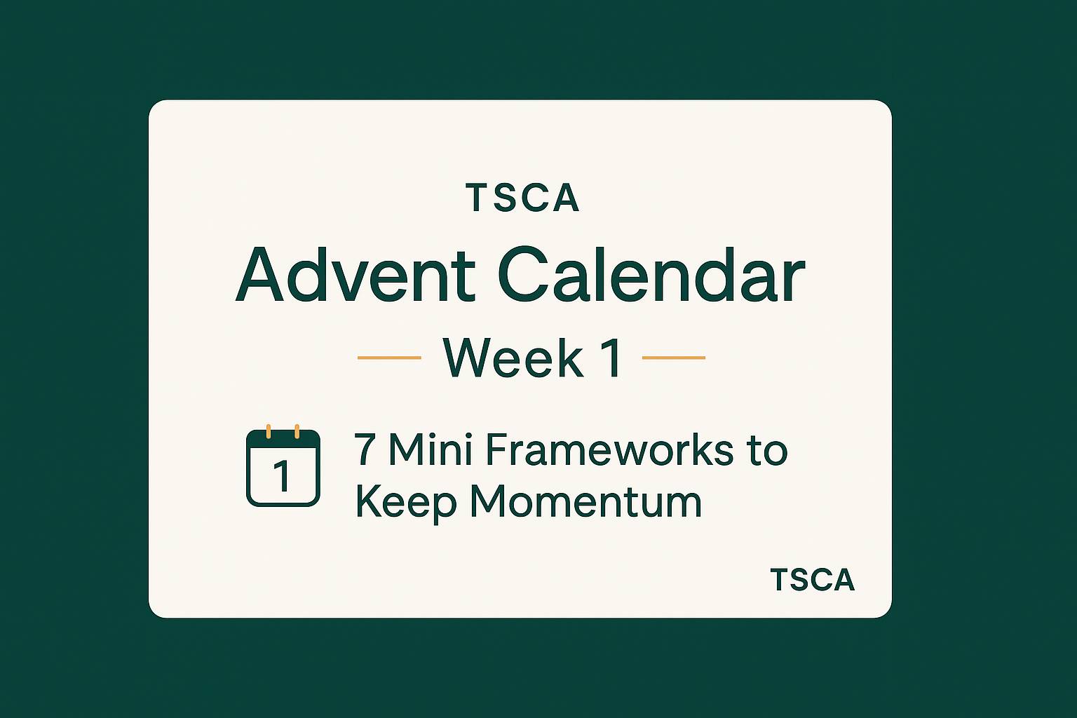 7 mini frameworks to keep your momentum during the chaotic festive season December’s a juggling act with family commitments, social plans, and year-end pressure at work. All while trying to enjoy the festivities. So this month, TSCA is running 5 simple Advent Calendar style editions for ambitious startup folks. Each Monday, you’ll get 7 tiny, actionable prompts (one for each day). No fluff. No guilt. Just practical ways to stay visible, protect your energy, and end the year with momentum you can roll into January. Whats the aim: